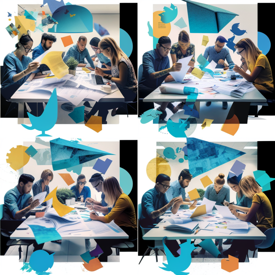 Prompt: social media banner, hyper realistic, group of employees, sitting around a table, working on papers, light colors, bright, sunny, happy people, blue colors