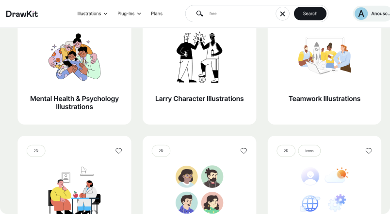 drawkit.com hat unterschiedliche Packages mit unterschiedlich Designten Illustrationen, passen zum jeweiligen Thema. Nachdem man sich registriert hat, gibt es Illustrationen, die man gratis nutzen kann. Auch hier können die Packages als SVG oder als PNG heruntergeladen werden.